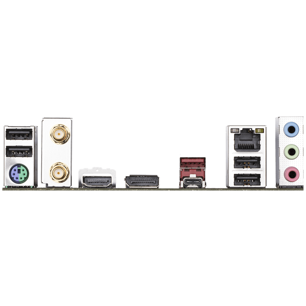 | Ports | 1 x PS/2 keyboard/mouse port2 x SMA antenna connectors (2T2R)1 x USB Type-C® port with USB 3.2 Gen 2x2 support1 x USB 3.2 Gen 2 Type-A port (red)4 x USB 2.0/1.1 ports1 x HDMI port1 x DisplayPort1 x RJ-45 port3 x audio jacks |