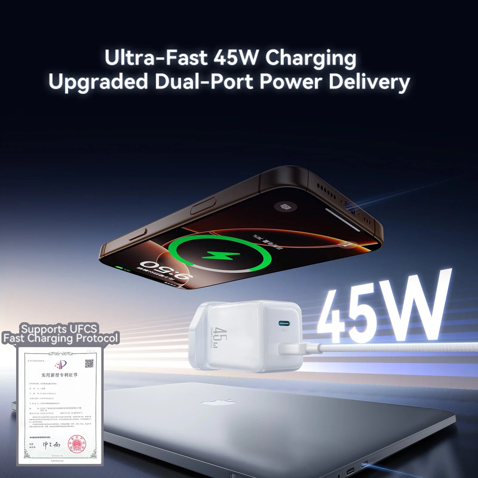 | Next-Gen GaN Mini Design | Compact GaN technology makes it 50% smaller than standard 45W chargers—perfect for travel or workspace use. |