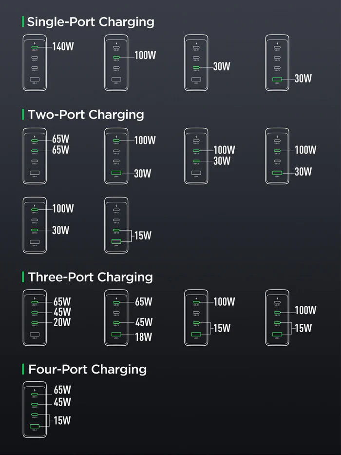 | USB-C1/C2 + C3 + USB-A Output | 100W + 15W |