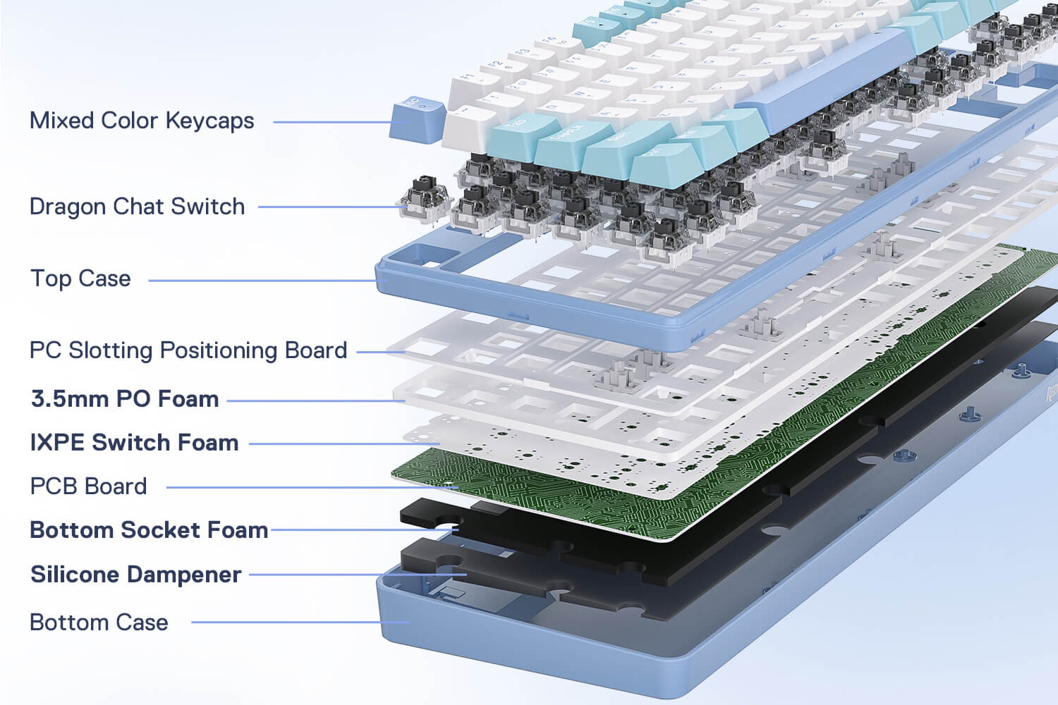 Redragon Gasket Out Design – Enhanced flexibility and sound dampening for a soft, balanced typing experience.
