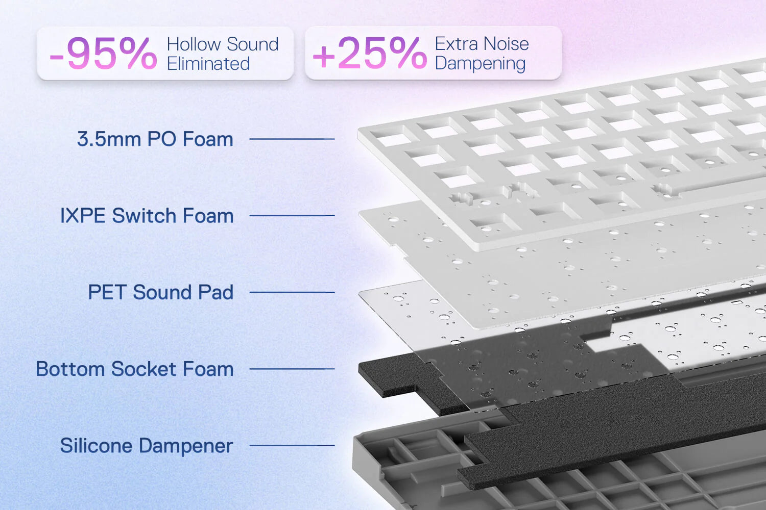 Engineered for silence and comfort, the K709 PRO features five layers of sound insulation — 3.5mm PO foam, IXPE switch foam, PET sound pad, bottom socket foam, and silicone bottom pad — in addition to the silicone gasket. These layers eliminate hollow resonance and deliver ultra-clean acoustics for every keystroke.