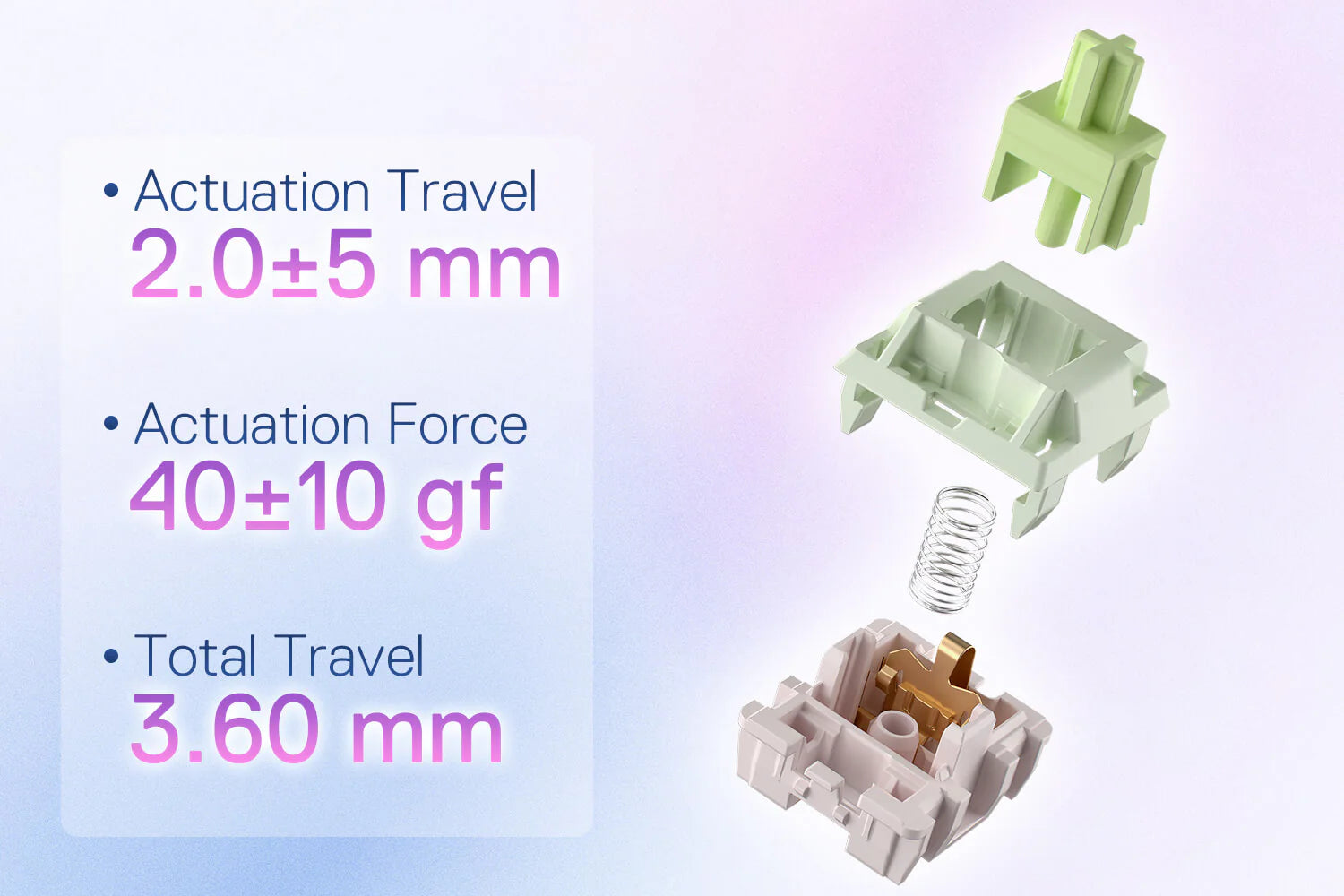 Equipped with thick-lubed custom linear Mint Mambo switches, this keyboard provides a silky-smooth and cushioned keypress. The upgraded hot-swappable socket supports nearly all 3-pin and 5-pin mechanical switches, giving you the freedom to customize your typing feel.